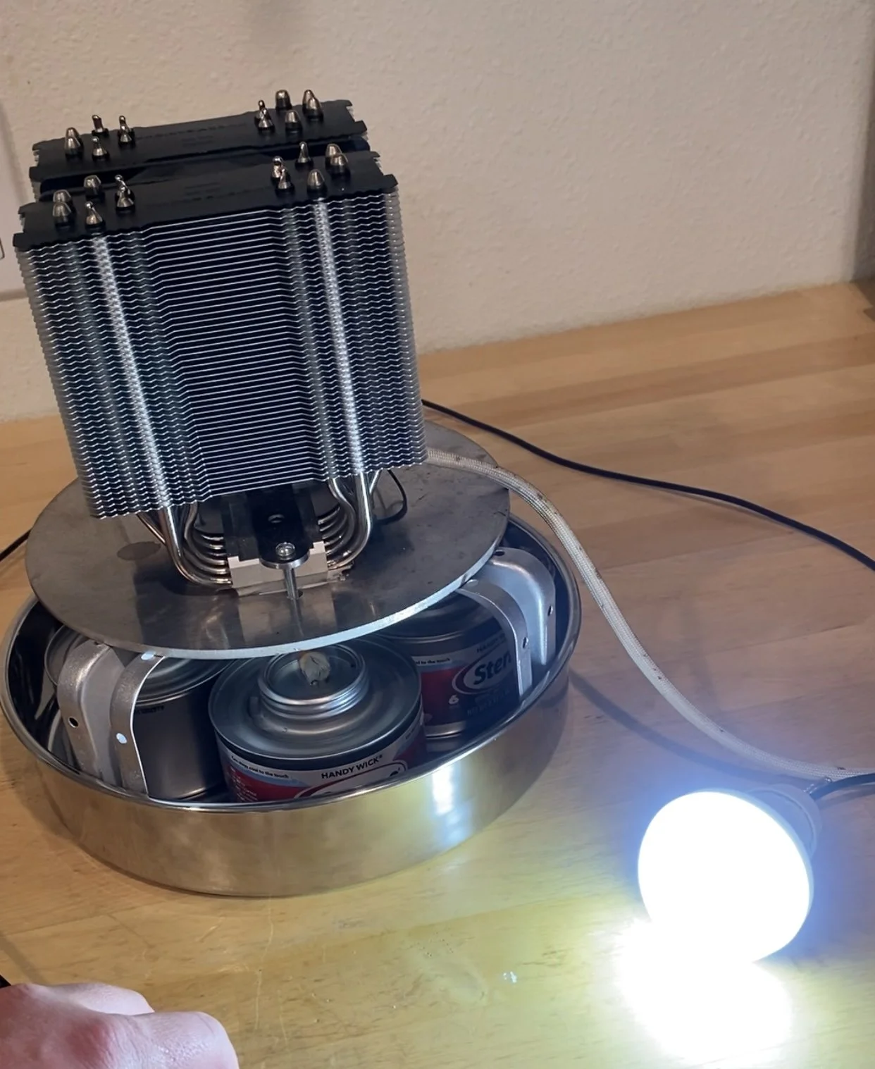 The Heat-Force Pro uses the thermal energy from canned heat to power its electric generators for up to 6 hours